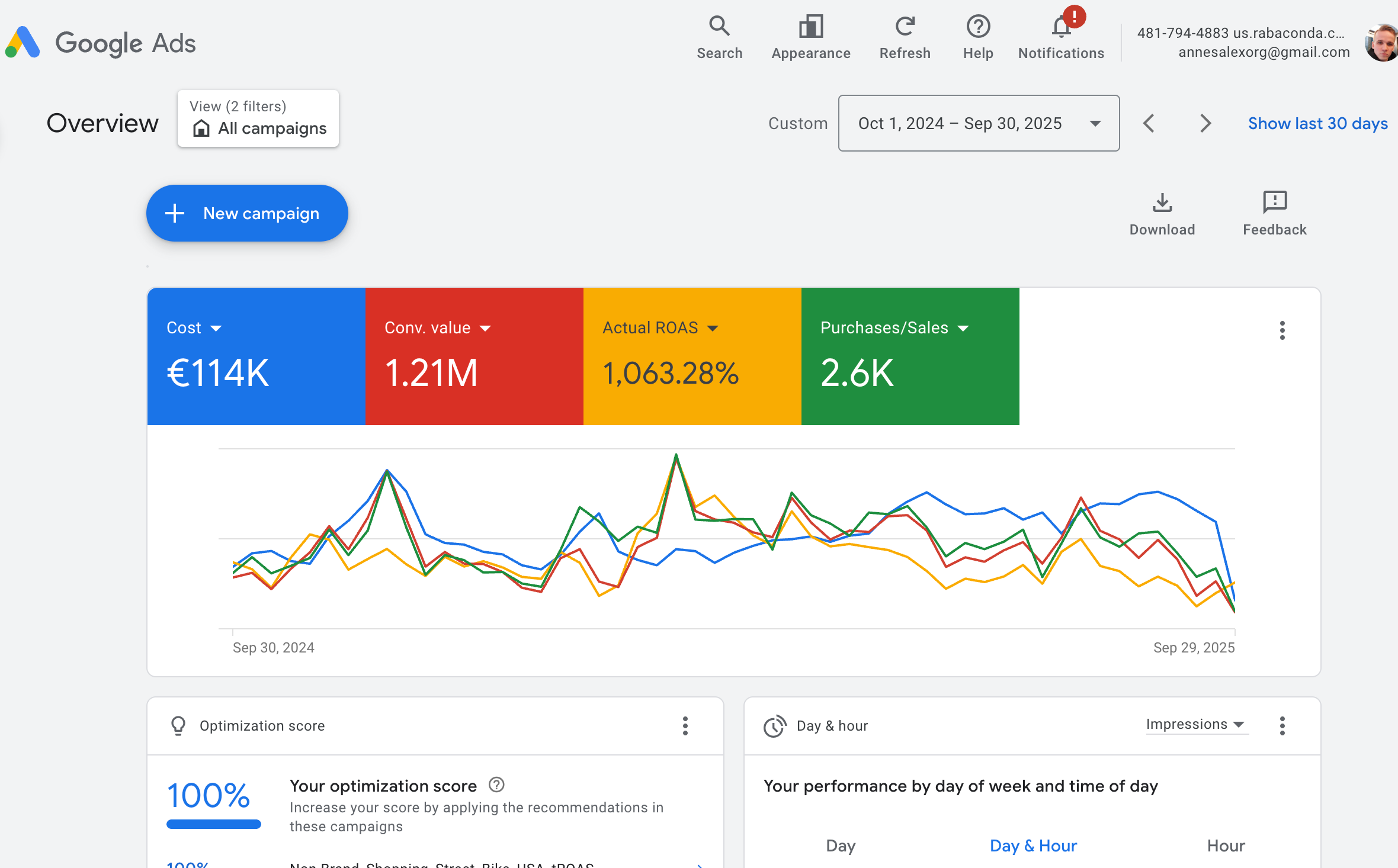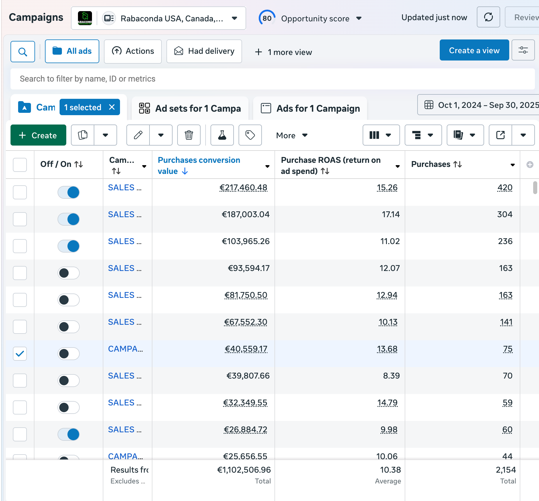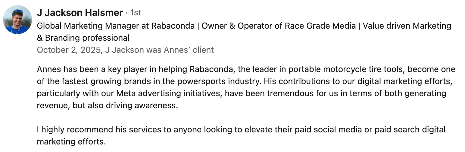 Rabaconda: $0 → $1.5M annual Paid Social revenue, 10x ROAS, 30% yearly growth.